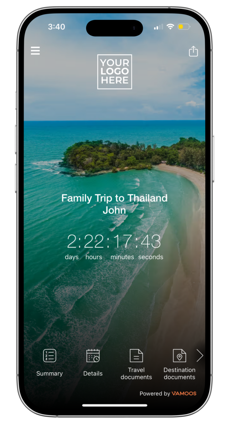 - Your logo on the Vamoos home screen will be seen by all your clients on a regular basis